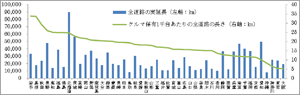 クルマ保有車1千台あたりの全道路の長さと全道路の実延長