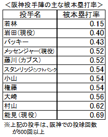 しかし今年は、岩田の復活に期待したい。なぜなら彼の手元で動くムービングボールは、打者にとっては相当打ちづらく厄介だからだ。実際、打たれたヒットはクリーンヒットが少なく、外野手と内野手の間にポトリと落ちたり、ボテボテのゴロが内野手の間を抜けるケースが多い。特に打ちづらさを如実に表しているのが、彼の被本塁打率の低さだ。その数字は0.40(被本塁打数×9/投球回数)で、阪神に在籍した投球回数500回以上の主な投手の中でも、上位に位置する。阪神の現役投手の中ではもちろんトップで、岩田の上にいる投手は、球団の創生期からエースとして活躍した若林(0.15)しかいない。剛腕ストッパーの藤川(0.52:現カブス)やエースの能見(0.69)をも凌ぐ。彼のムービングボールがいかに打ちづらいかが象徴されていると思う。